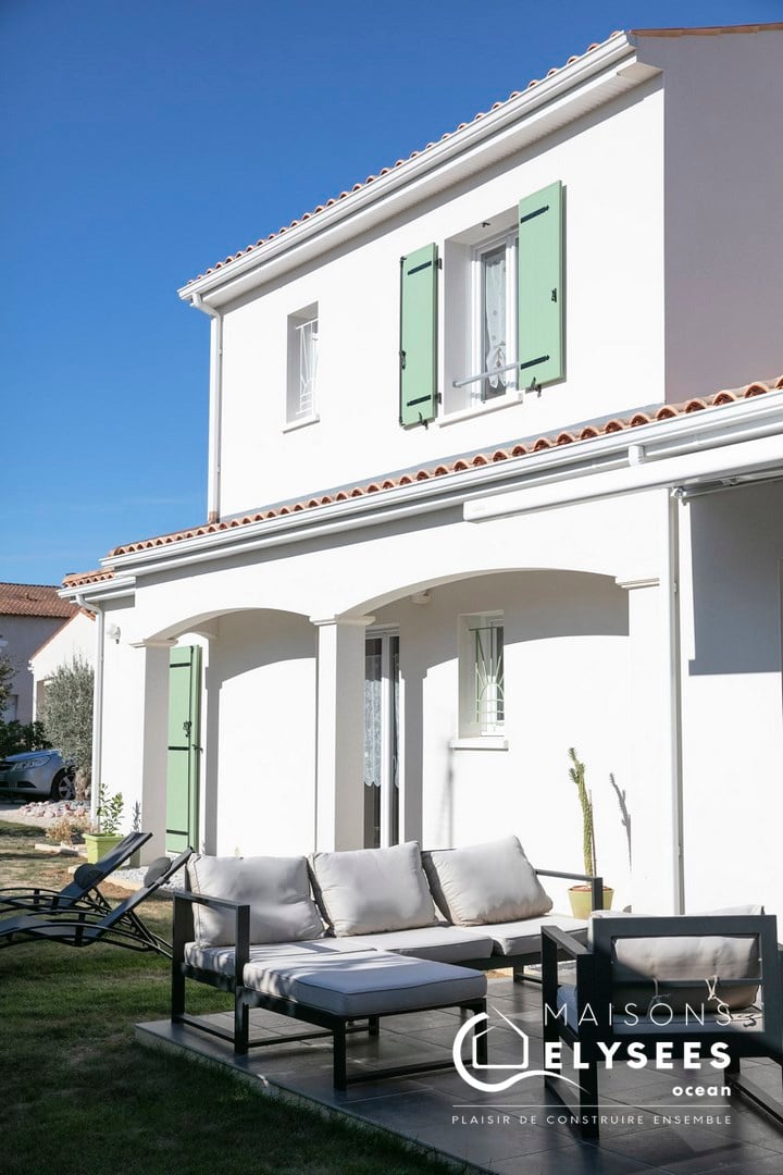 Contraste du bardage d’un bleu ciel et du crépis très blanc qui montreront toute leur élégance dans l’écrin du futur jardin paysagé.