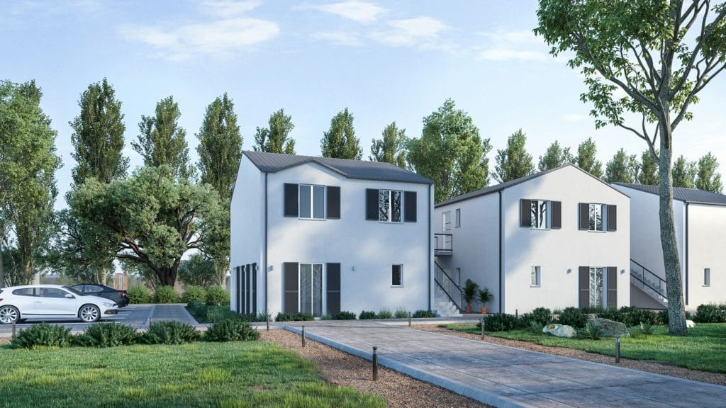 Ces maisons accueillent 13 logements de types T2 au T5 avec jardins paysagés et parkings individuels. Il inscrit dans une démarche de rénovation urbaine.